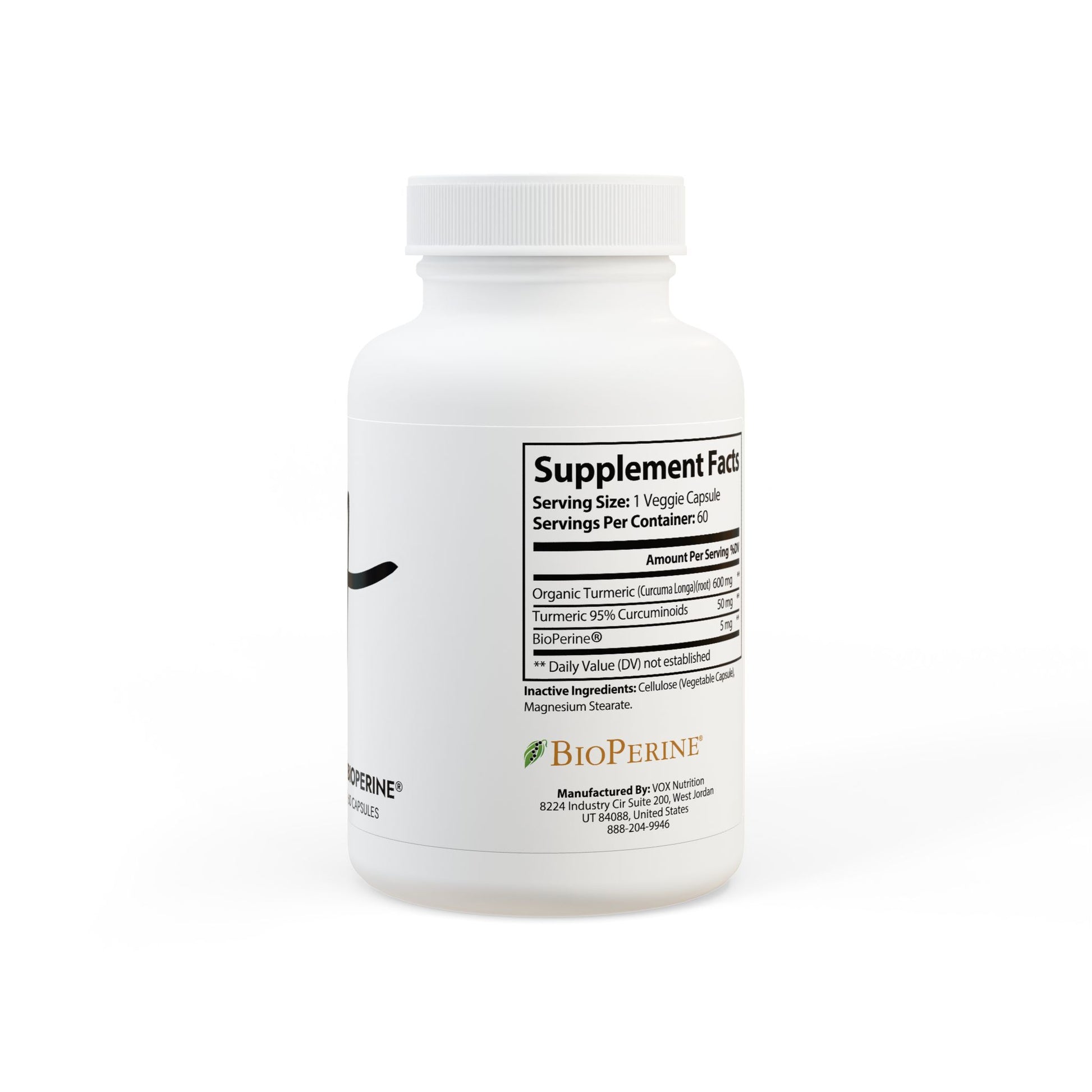 Ingredients: Organic Turmeric (Curcuma Longa)(root), Turmeric 95% Curcuminoids, BioPerine. Inactive Ingredients: Cellulose (Vegetable Capsule), Magnesium Stearate.